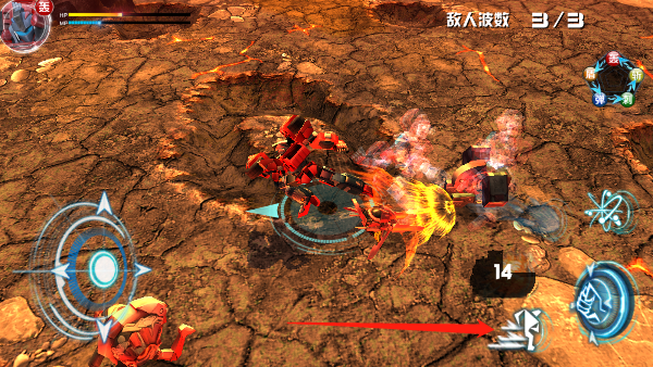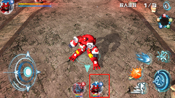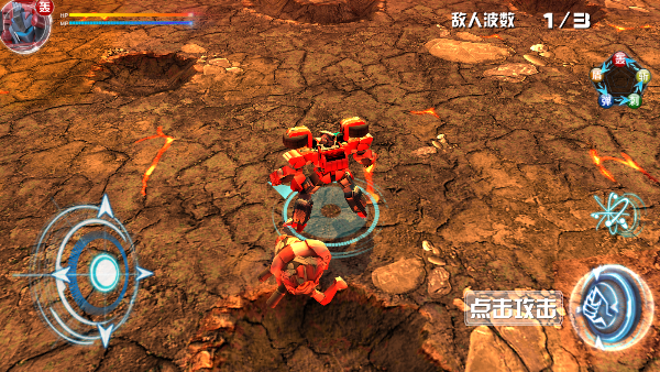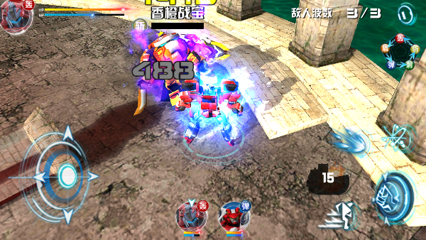 左侧虚拟摇杆掌控移动方向,右侧主攻击键释放普攻与技能,右上方独立设置的变身按钮则触发机甲形态转换,三者协同构成流畅战斗手感。