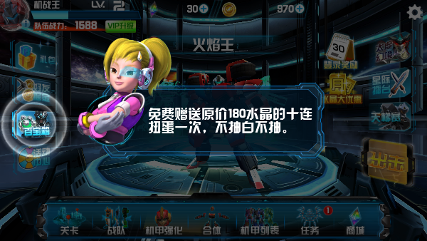 通关首关即可进入主城大厅,点击百宝箱参与免费扭蛋抽取,随机获得稀有机甲或强化材料。