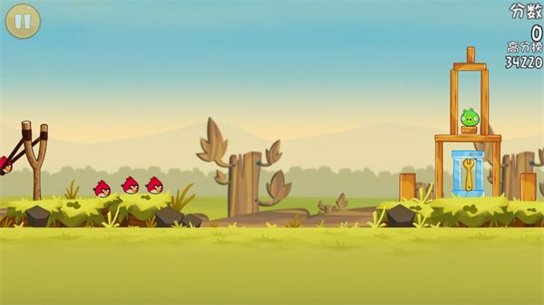 选定具体关卡后,屏幕中央出现弹弓与待发射的小鸟;
