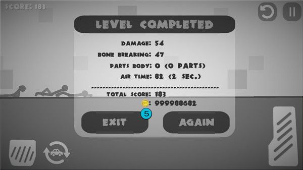 操控核心集中在三个动态按钮:左侧按键控制车辆减速或倒车,右侧长条滑块用于持续加速推进,带汽车图标的按钮则触发空中重置——让载具连同火柴人一起从高处坠落。三者交替使用,能制造出连续撞击、错位挤压、二次弹射等复合伤害效果。