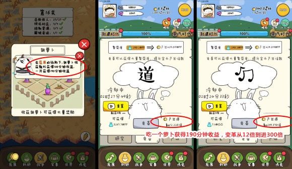 完成上述升级后,可自由点选其他非核心项目,兼顾资源收集与进度推进。随后切入萝卜获取环节:战争结算、早晚餐事件、周末神兽挑战等均可阶段性提升金币收益与繁荣度,但切记不可连续食用萝卜或连刷挑战——单次萝卜带来300倍增幅,若连吃两次仅为600倍叠加,而吃一次即变革一次,则达成300×300=90000倍质变。