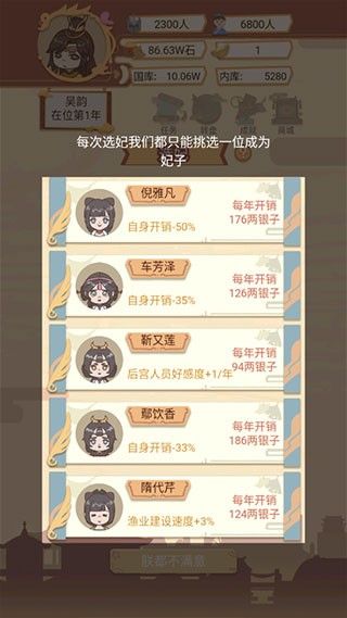 朝政系统分为多个模块:奏折批阅关乎国库盈亏与百姓安危;地方建设影响赋税根基与民生稳定;军事调度不仅涉及军备升级与兵员征召,更可主动发起战事,夺取邻邦城池;而皇宫内部则需统筹妃嫔位份、太监宫女调配及内廷秩序。