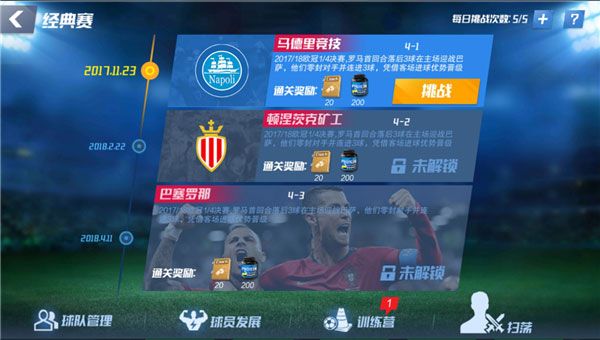 生涯赛是踏入足坛的第一课,三十轮联赛横跨欧洲五大主流赛场,考验你对战术克制关系的理解与临场应变能力。实力达标后,热身赛随之解锁,每日限次挑战,专为球员突破提供核心道具,务必优先刷满。经典赛则带你重返足球史上的高光时刻,以真实战役为蓝本,复刻传奇对决氛围。排位赛是真正的硬核较量,胜负由赛前布阵决定,没有实时操作干扰,全靠你对对手阵型与战术逻辑的预判力。巡回赛主打跨界协作,派出爱将加盟他队征战商业赛;挑战赛强调条件匹配,15关层层递进,满足特定要求才能赢取丰厚结算奖励。